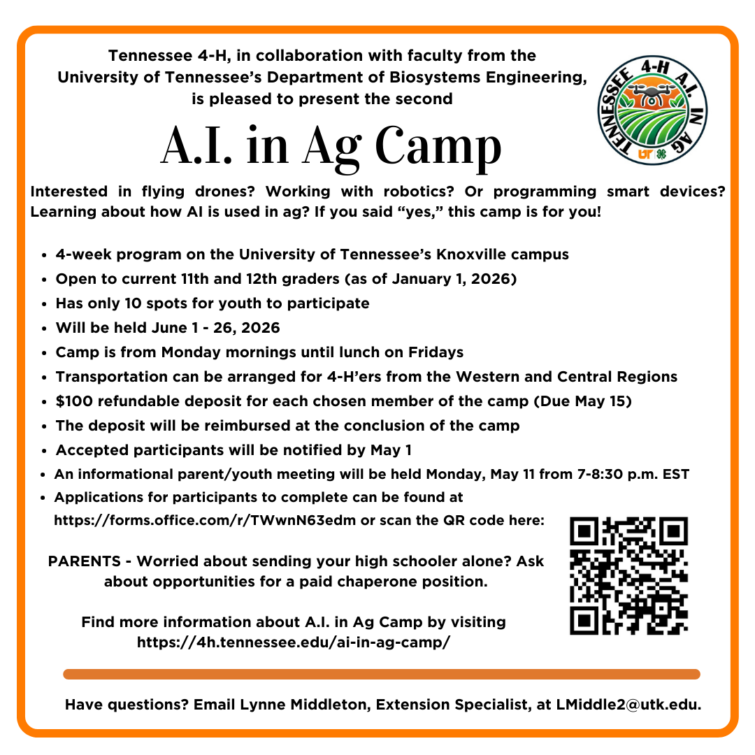 Interested in flying drones? Working with robotics? Or programming smart devices? Learning about how AI is used in ag? If you said “yes” this camp is for you! 4-week program on the University of Tennessee’s Knoxville campus. Open to current 11th and 12th graders, limited spots, June 1-26, 2026: Click for more information