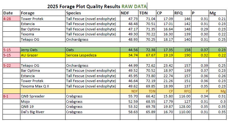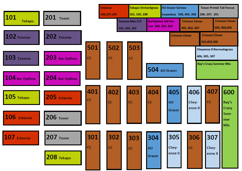 Warm season annuals were planted June 5th. Planted warm season annuals include: Dal’s Big River Crabgrass, Quick N Big Crabgrass, Quick N Big Spreader 19 Crabgrass, and back for the second year: Ray’s Crazy Summer Mix. This mix includes BMR Sorghum-Sudan, Cowpeas, Daikon Radish, Peredovik Sunflower, T-Raptor Hybrid Brassica, and Kings 200 Sudangrass. Warm season perennials, planted last year, include Cheyenne II Bermudagrass and AU Grazer Sericea Lespedeza. Another warm season annual that is back from last year is Mojo crabgrass. Last year’s Mojo plots were left alone to determine how well it reseeded itself. The answer: Very Well.